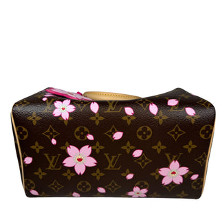 • This re-edition of Takashi Murakami's Speedy is crafted in the iconic monogram-coated canvas with pink vintage cherry blossom floral motifs. It features top handles and trim and a bag charm and opens to a pink microfiber interior.
